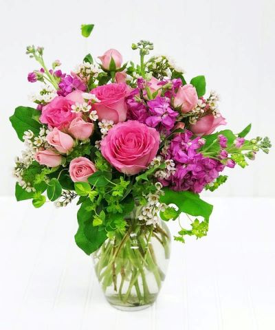 A beautiful combination of roses and stock with accent flowers in a vase in shades of pink and lavender. Exact flowers may vary