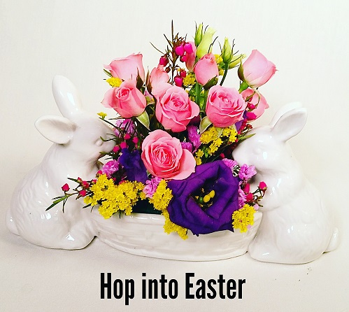 This keepsake double bunny ceramic container filled with colorful spring blooms is a perfect gift for the Easter season. Best of all the container can be used all spring long and used for candy too! Flowers may vary depending on availability. Limited quantity available.