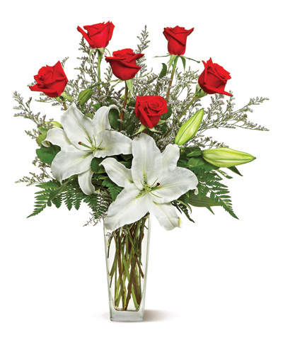 Red roses and pure white lilies are two of the most elegant blossoms in nature; combined in one lovely floral arrangement, they create double the flower power! A simple and elegant display that will make someone sit up and take notice.