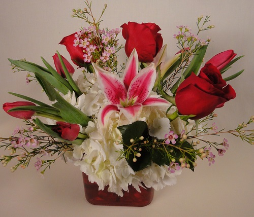 Hand-gathered from select floral farms, and displaying the sweet, traditional color combination of red, pink and white, this fresh flower bouquet is presented in a red glass vase making this the perfect way to celebrate your love this Valentine’s Day. Bouquet includes: red roses, red tulips, pink lily, white hydrangea, and wax flower. Bouquet is approximately 8″H x 8″W.