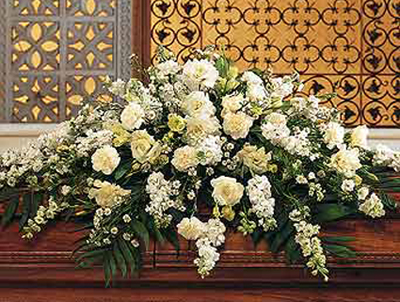 This casket spray with its array of white carnations, larkspur, asters and stock adds a pure and loving gesture to the service.