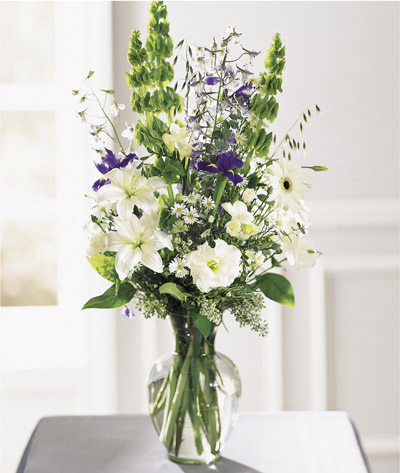 Imagine an enchanting spring garden. This bouquet makes it real – lovely white lilies, lisianthus and freesia combine with stately blue belladonna, Bells of Ireland, and purple iris. Best of all, you can bring this garden indoors.